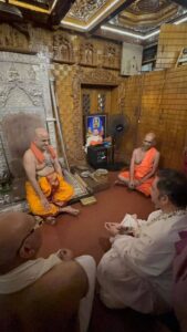 Shri Manmadhava Gaudeshwar Vaishnava Acharya Shri Pundrik Goswami Ji, is the Grandson of Famous Saint Shri Atul Krishna Goswami Ji Maharaj & son of famous Bhagwat orator Shri Shribhuti Krishna Goswami ji maharaj. He belongs to the family of Shri Gopal Bhatt Goswami ( One of the Famous Six Goswamis of Vrindavan who were inspired and initiated by himself Shri Chaitanya Mahaprabhu) who established the Radha Raman Temple in Vrindavan in 1542 and also his samadhi exists within the temple premises. Maharaj Sri is the 38th Acharya in the lineage of Gaudiya Parampara.
