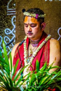 Shri Manmadhava Gaudeshwar Vaishnava Acharya Shri Pundrik Goswami Ji, is the Grandson of Famous Saint Shri Atul Krishna Goswami Ji Maharaj & son of famous Bhagwat orator Shri Shribhuti Krishna Goswami ji maharaj. He belongs to the family of Shri Gopal Bhatt Goswami ( One of the Famous Six Goswamis of Vrindavan who were inspired and initiated by himself Shri Chaitanya Mahaprabhu) who established the Radha Raman Temple in Vrindavan in 1542 and also his samadhi exists within the temple premises. Maharaj Sri is the 38th Acharya in the lineage of Gaudiya Parampara.