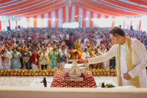 Living in the midst of Satsang, the waves of devotion and Katha will wipe off the material dirt and the sins will be washed away.