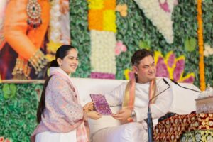Gurudeva Maharaj says Shree Thakurji’s swaroop is real. This belief is the first step in Bhakti. He is real, here and now! ‘Hari merey saath lagey sanga sanga dolay’. When you leave home you check whether your relations like brother, sister, husband, wife, etc are walking with you or not? We should tell Shree Thakurji, please come along, let’s go for the Katha. When you request Shree Radha Ramanju, you will experience that He is seated next to you. When you go to the temple, take your Guru along and when you visit your Guru, take Shree Govind along. This is the secret of life. When you visit Shree Radha Ramanji or Shree Radha Vallabhaji or Shree Bankey Bihariji, then request Shree Gurudev to be seated within because only through his grace Shree Thakurji will recognize you. Pray and invoke his blessings. In our Gaudiya tradition, we first bow down to our Gurudev. ‘Vandey Shree Guru charanarvindam’. He is the one who has anointed our forehead with the Tilak. If you carry the world along when you visit the abode of your Guru, you will discuss only material issues. When you go with the awareness of Shree Jagannath within then you will engage in a spiritual discourse.